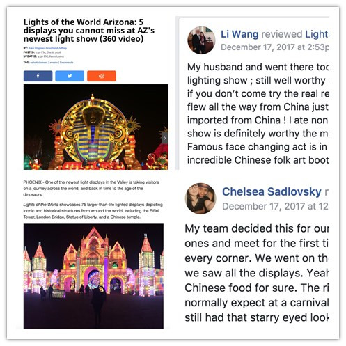 本次燈展是東方彩燈繼2016第一次成功舉辦美國菲尼克斯彩燈嘉年華的再次完美呈現。2017美國菲尼克斯彩燈嘉年華,自開展以來備受美國當地民眾熱捧和各大主流媒體關注、在facebook等社交平臺更是掀起了中國彩燈熱潮,菲尼克斯當地新聞《 Now @ 6 》報道稱“2017世界之光彩燈嘉年華是北美最大的彩燈節,是全球文化集合地,游客仿佛置身于迪士尼中。”