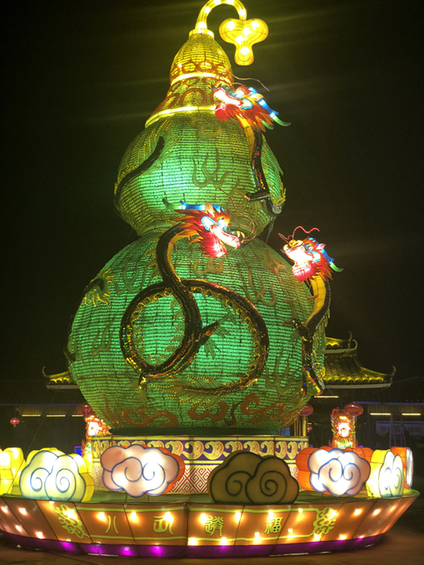 龍,中華民族的傳統象征,《二龍戲珠門》場景恢弘大氣。“五湖四海任遨游,岳山矗立花如海。龍脈潛在南渡江,騰龍啟程更輝煌”。
