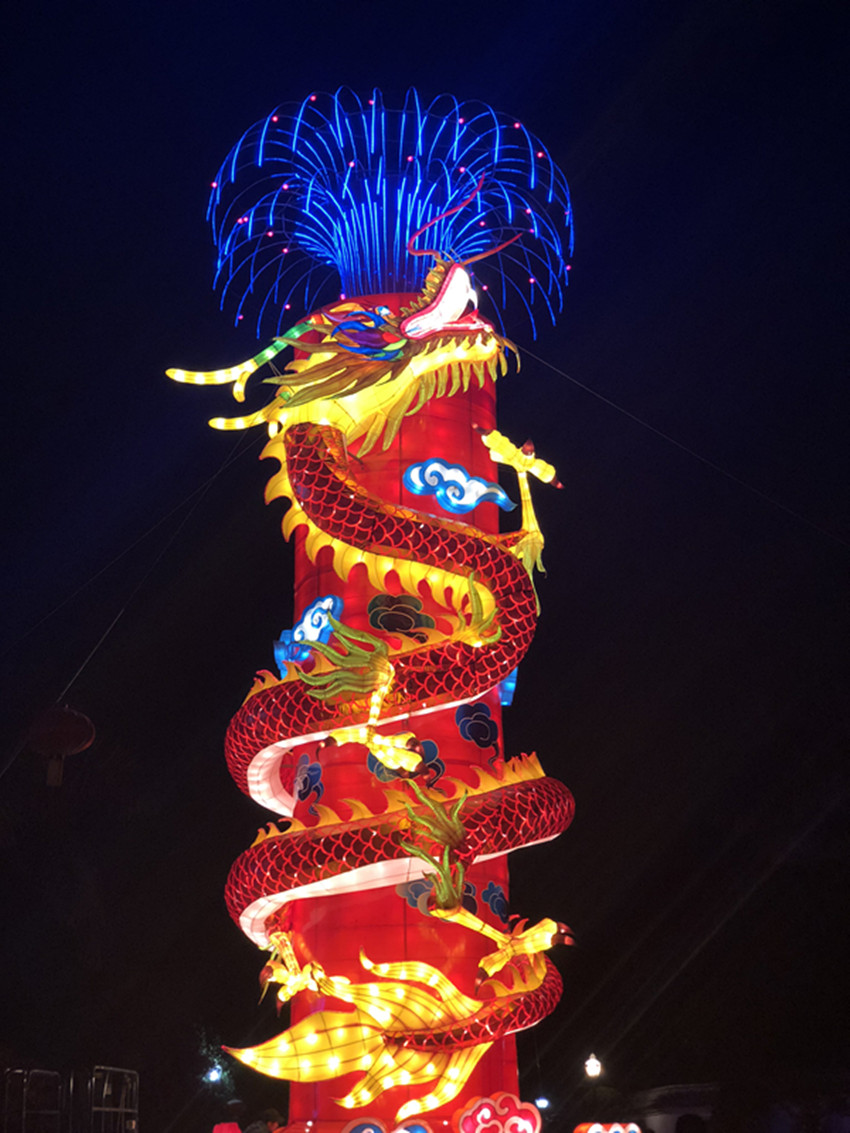 16米高的《龍柱禮花》,用中國傳統瑞獸龍為設計主題,繞柱而上,造型獨特,寓意鵬程萬里。
