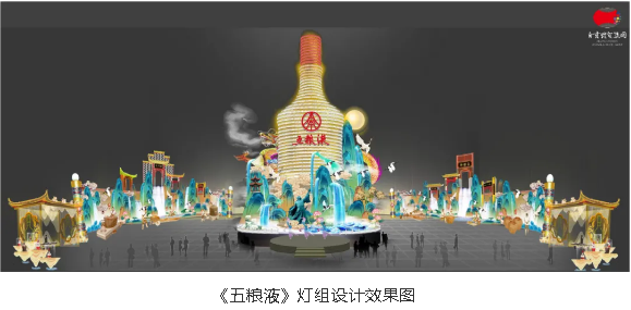 千年悠悠酒香,百年五糧精華。自貢燈貿集團承制的大型場景式燈組《五糧液》,主燈采用第八代五糧液酒瓶運用自貢彩燈傳統工藝捆扎而成巨型五糧液,輔以仙山、仙境、巨龍騰越氛圍闡釋五糧傳奇,杯酒時光,百年味道。周邊群燈組展示封存在時光中的“活窖池”--利川永、張萬和、劉鼎興、天賜福、聽月樓、全恒昌等八家明代釀酒作坊,歷史悠久的古窖池群講述著傳承幾百年的五糧液釀酒工藝,折射幾千年氤氳酒香的中國酒歷史和酒文化。歲月悠悠,五糧芳香的故事將不停地續寫,在未來再創輝煌,歷久彌香,延綿不斷地傳承這千古佳釀。