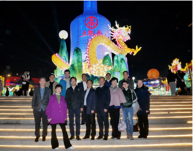 (考察團一行在公司創意、設計、制作的《五糧液》燈組合影)