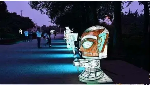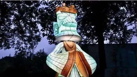 據(jù)自貢燈貿(mào)集團(tuán)設(shè)計總監(jiān)陳潔介紹,在入口廣場處的燈組以青銅縱目面具為設(shè)計原型,作為三星堆“六大國寶”之一的青銅縱目面具,寬1.38米,高0.645米,眼睛呈柱狀向外凸,是館藏中形體最大的青銅面具。本燈組按比例還原青銅縱目面具,燈組高3.2米,寬3.4米。