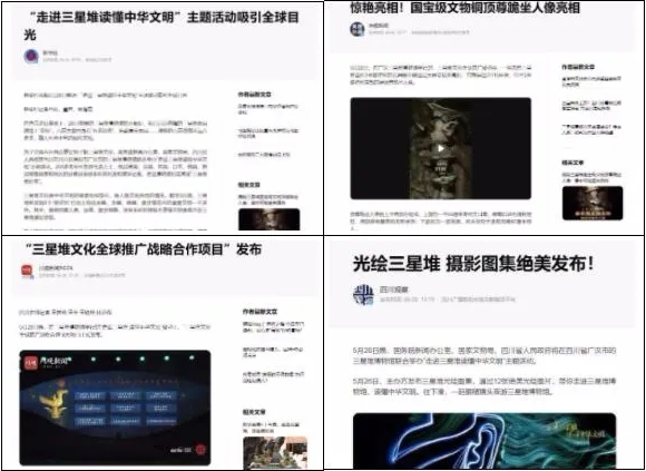 截至5月29日10點,各大主流媒體紛紛推出《光繪三星堆 攝影圖集絕美發布!》《揭開古蜀國神秘面紗 走進三星堆體驗博物館奇妙夜》《新出土千余件重要文物后 三星堆吸引中外媒體讀懂中華文明》《三星堆國寶文物銅頂尊跪坐人像亮相!》《“三星堆文化全球推廣戰略合作”9大項目正式發布》等新聞報道。