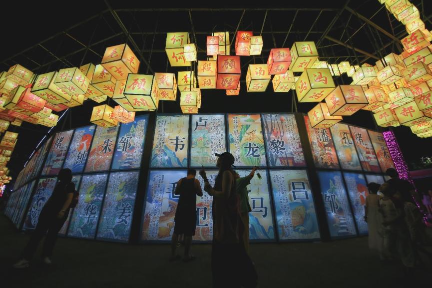 本次燈會刮起濃濃“國潮風(fēng)”。燈會入口是一座中式建筑風(fēng)格的迎賓門,長達(dá)50米的迎賓廊道掛滿燈籠,市民游客穿行其間,恍如置身漢唐;十二生肖彩燈俏皮靈動,精致絢爛;百余句經(jīng)典詩詞點亮道旁樹木;百家姓燈籠組成長龍,中華傳統(tǒng)文化韻味十足。